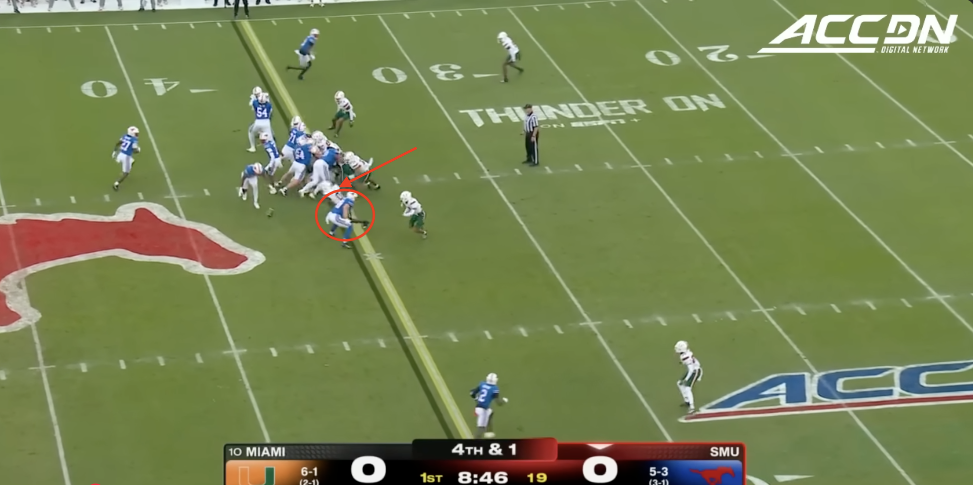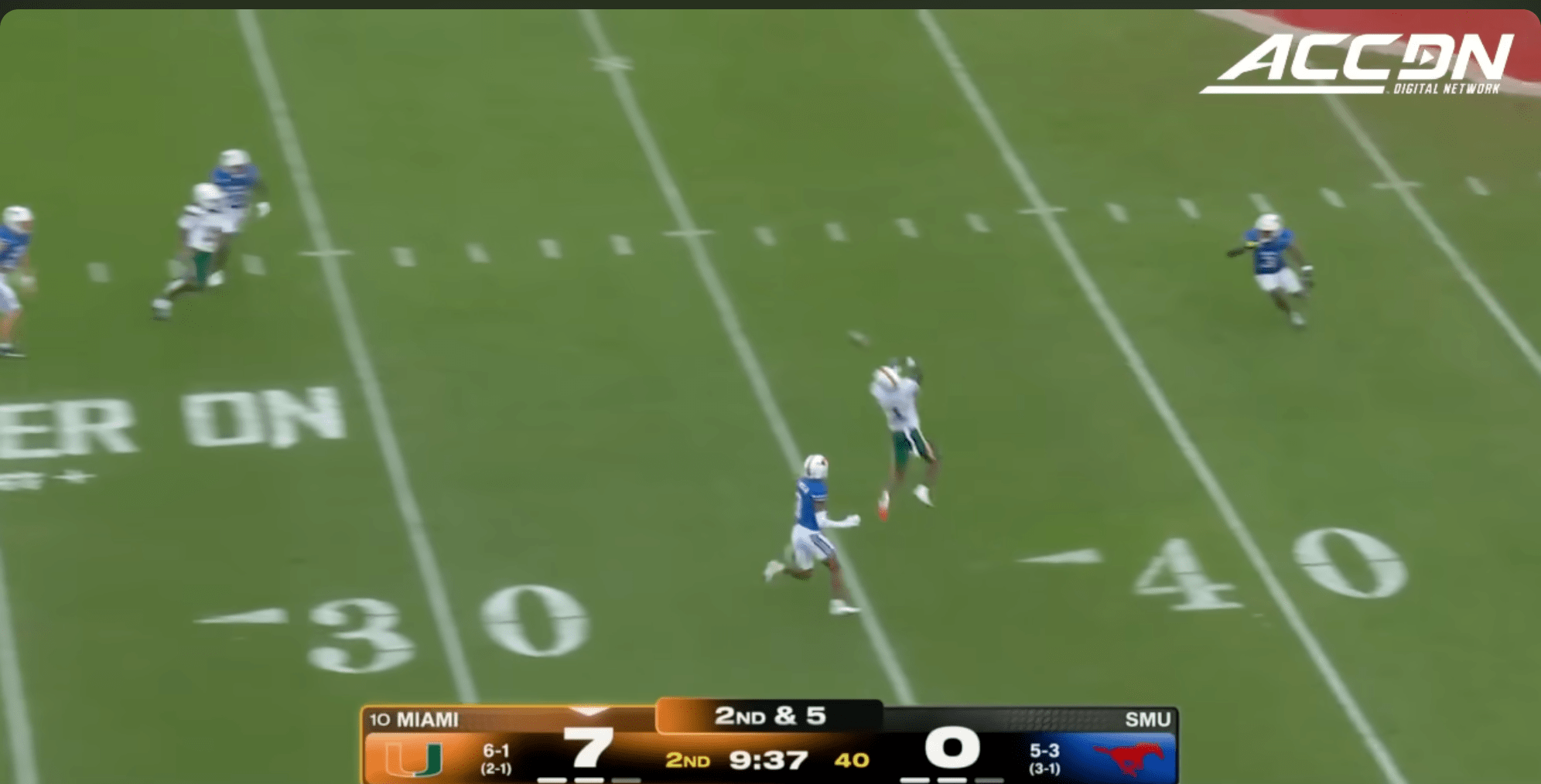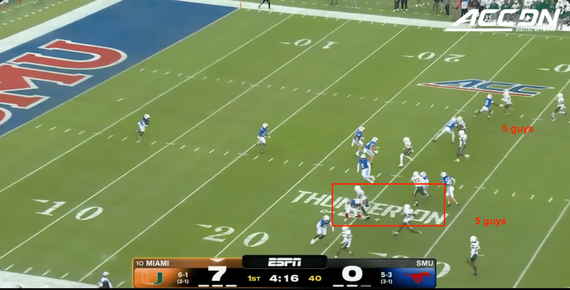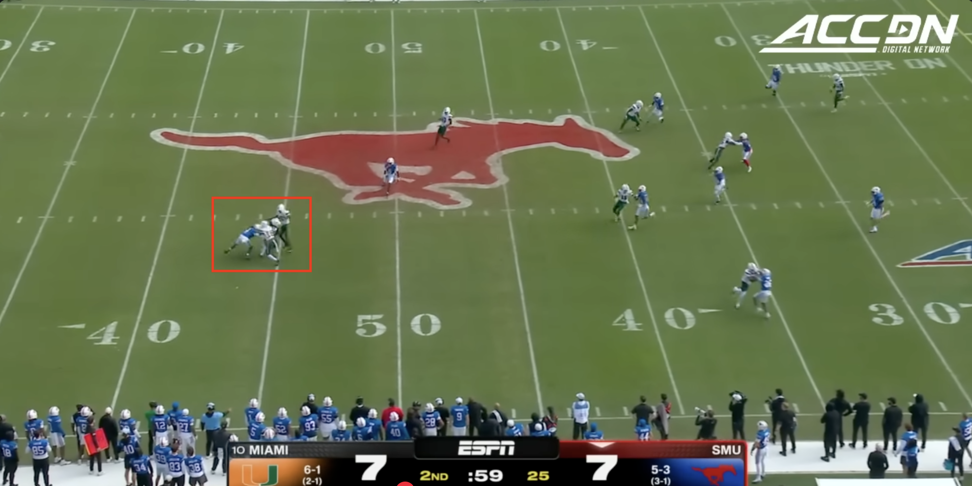 Miami was plagued by penalties once again including multiple pre-snap violations that included another James Brockermeyer snap infraction. Alex Mirabal can’t coach centers and clearly can’t pick ‘em anymore either. What a disaster this portal pick-up has been. This time Miami was flagged for 96 yards to SMU’s 40.