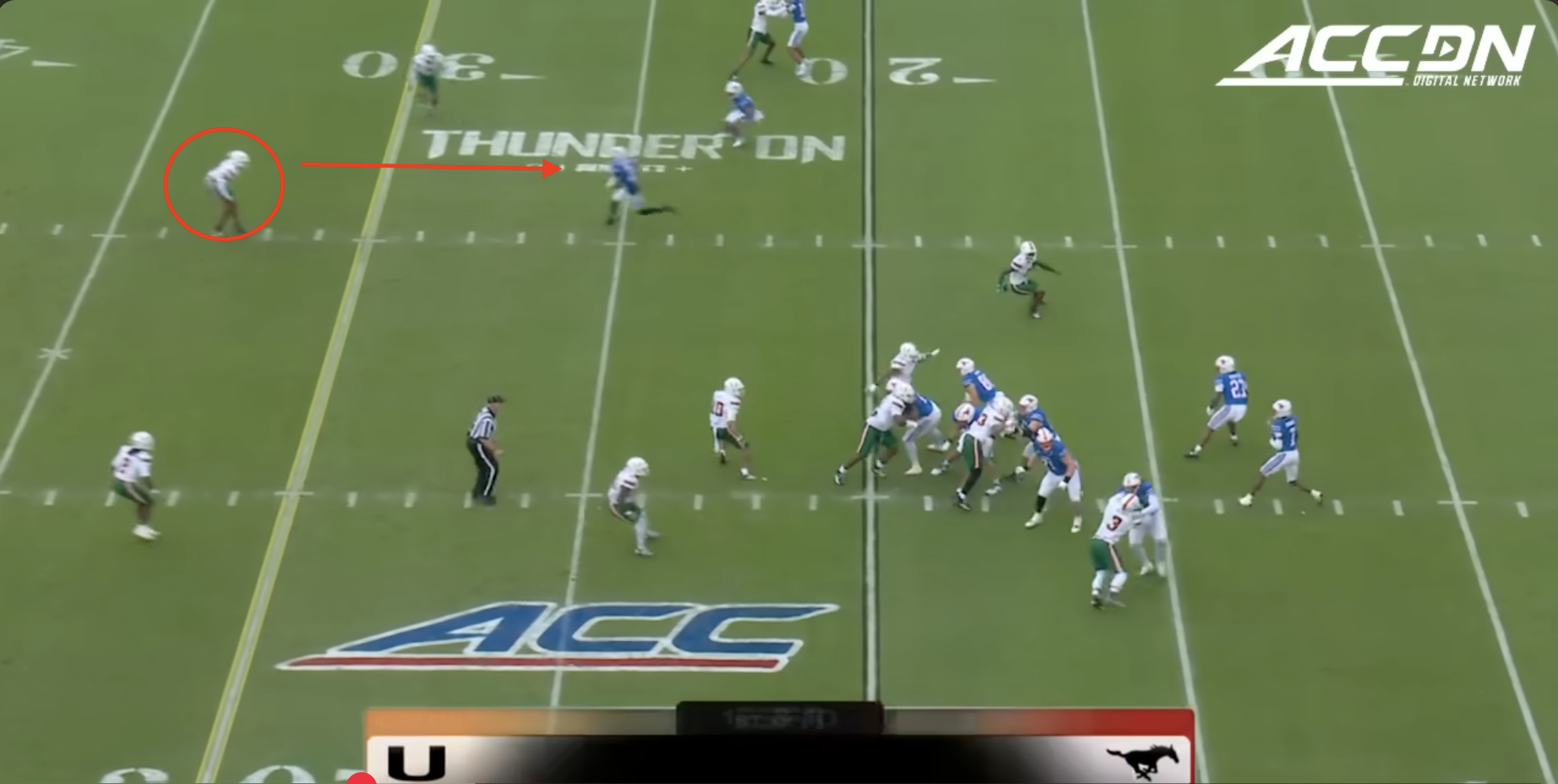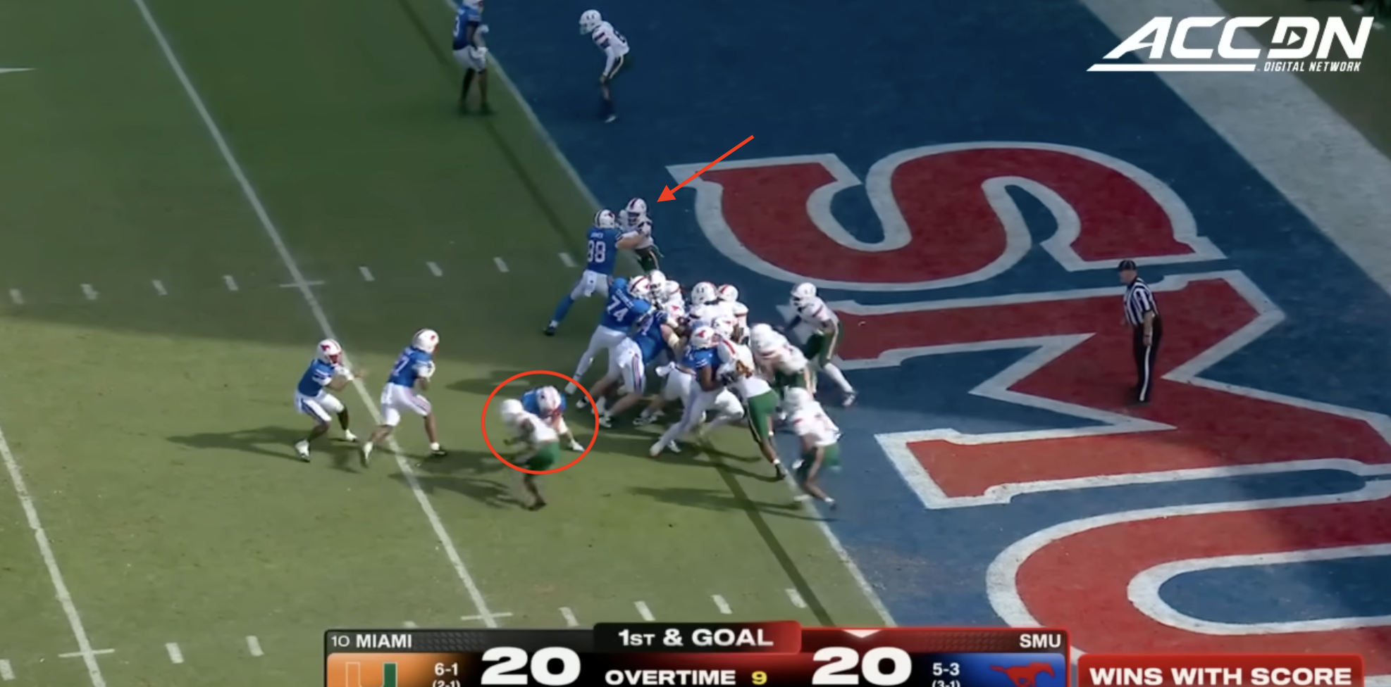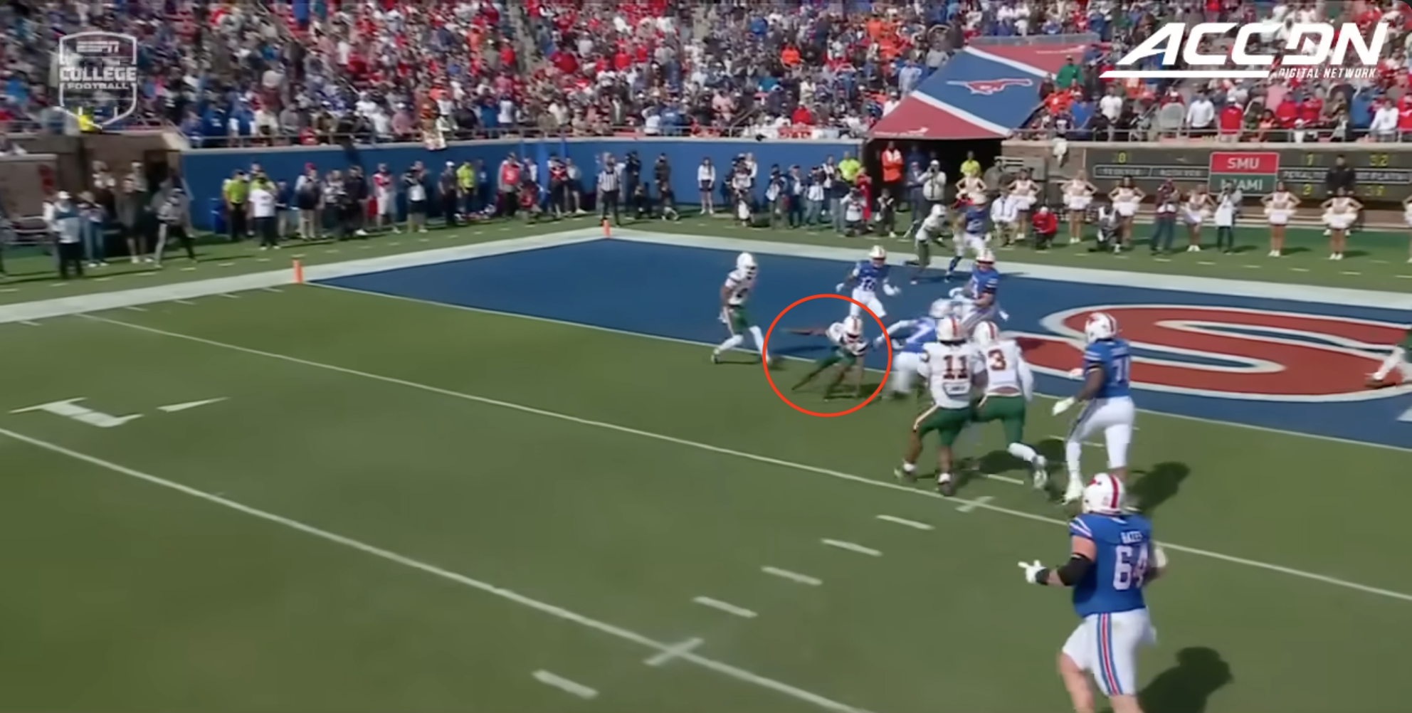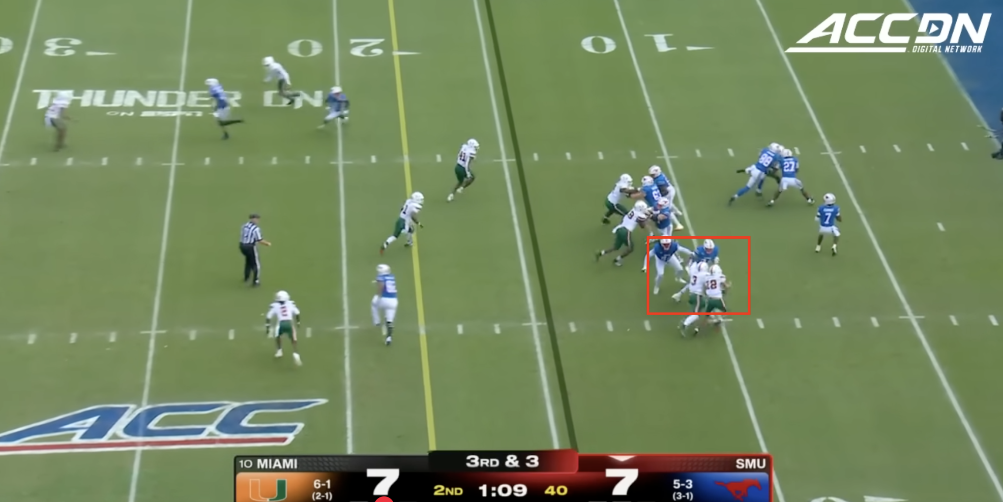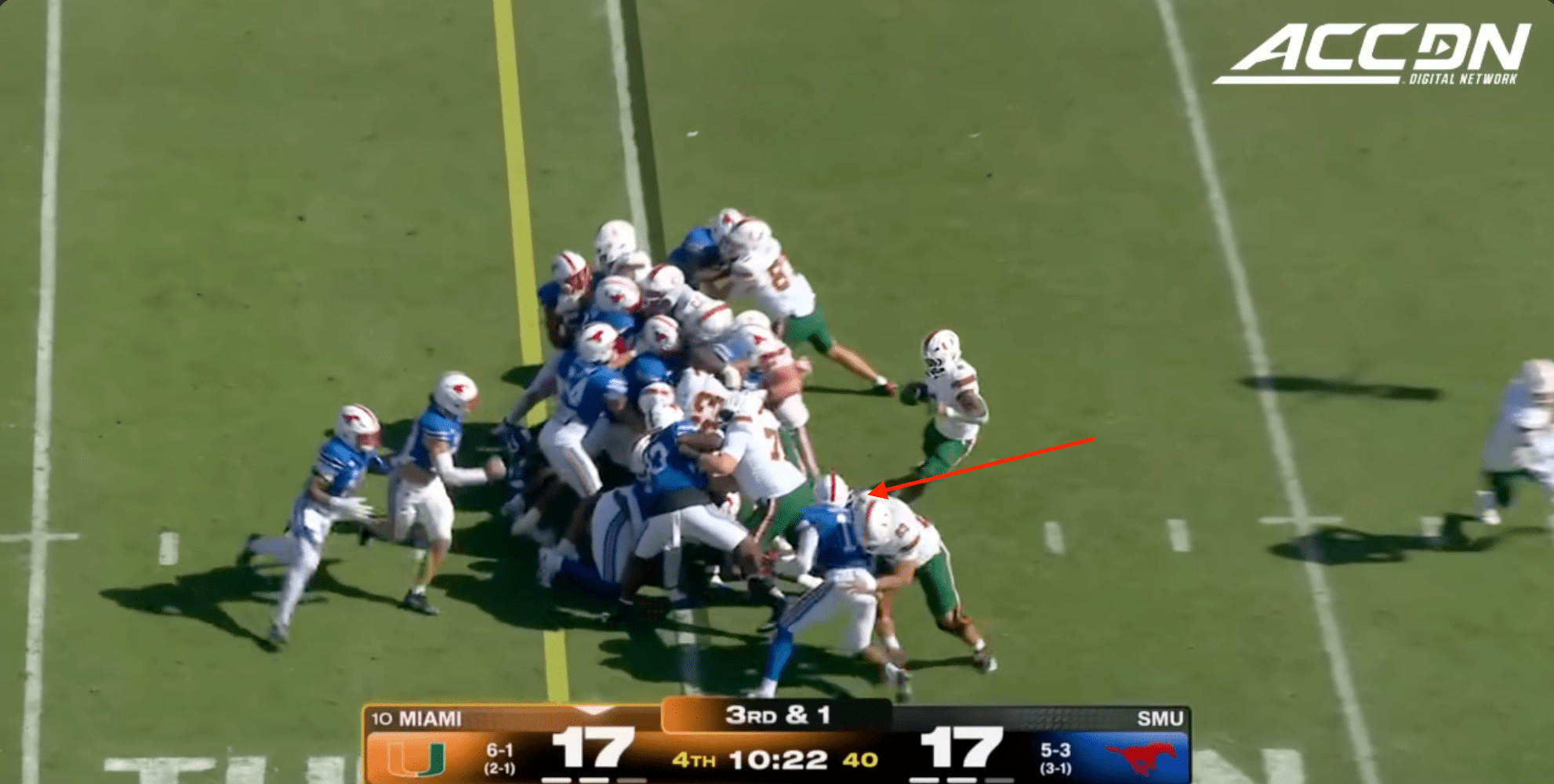 Miami was plagued by penalties once again including multiple pre-snap violations that included another James Brockermeyer snap infraction. Alex Mirabal can’t coach centers and clearly can’t pick ‘em anymore either. What a disaster this portal pick-up has been. This time Miami was flagged for 96 yards to SMU’s 40.