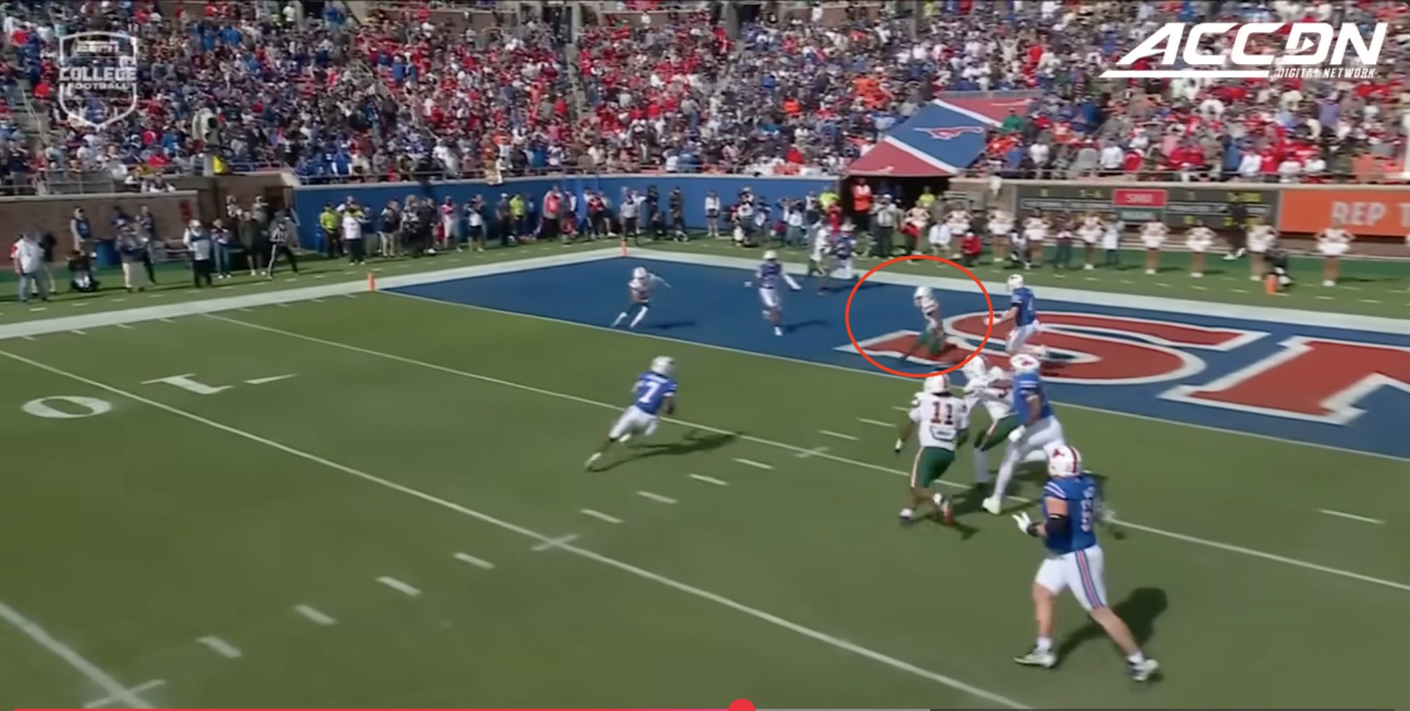 SMU’s defender wrong arms the kick out like he should, which forces the ball to either VERY wide bounce (nope) or try to fit in the hole (nope). It’s a TFL.