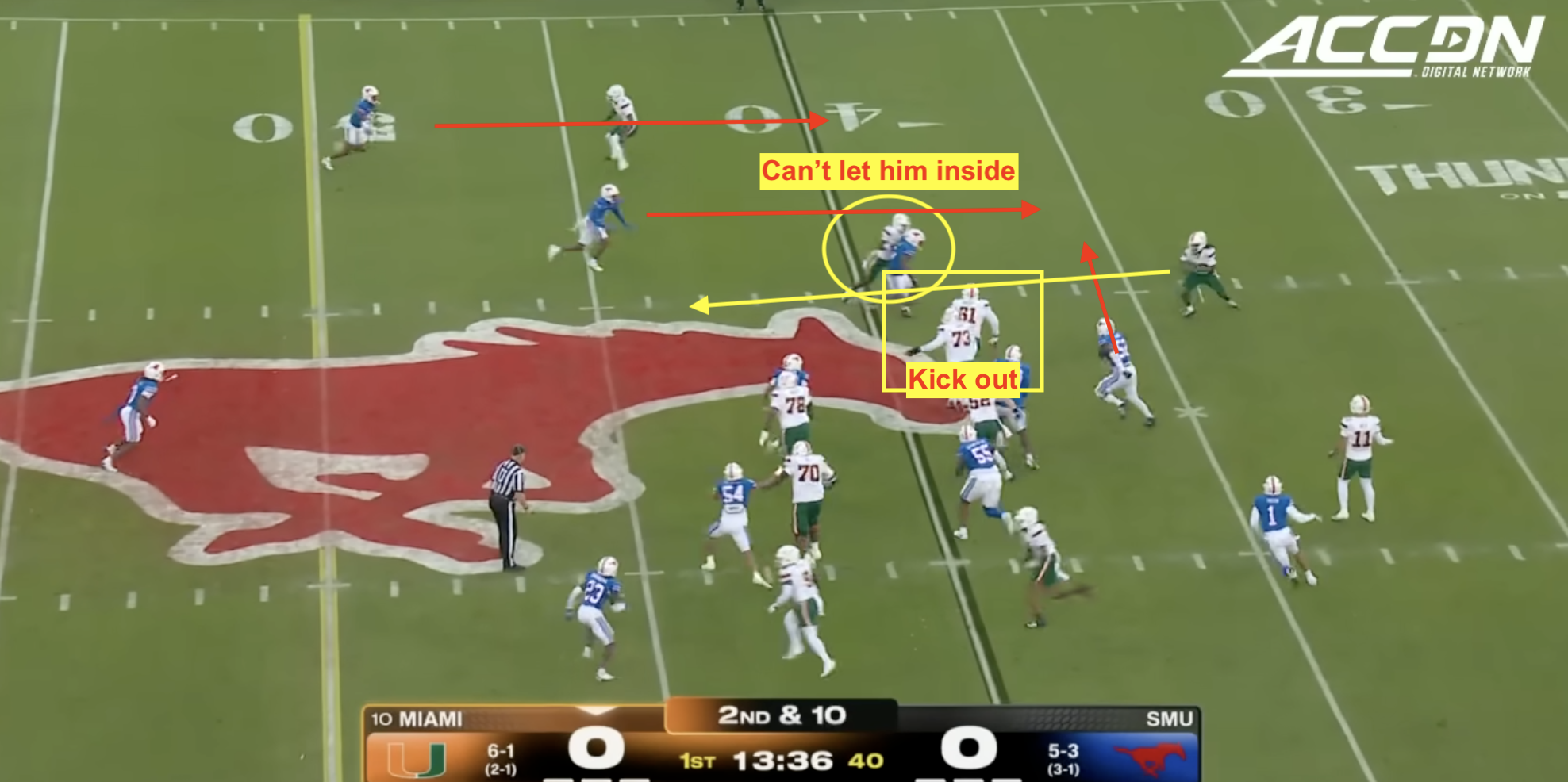 Above- OK hang in there with me. The yellow is what Miami needs to do. The red is what SMU is doing. The OT and OG for Miami need to kick out (push to sideline) the SMU LB and S. The WR can’t let the SMU LB beat him inside but does.