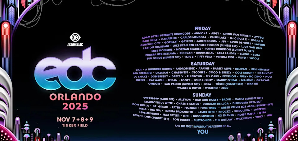 EDC takes place from Friday, Nov. 7 to Sunday, Nov 9, 2025, at Tinker Field in Orlando, FL.