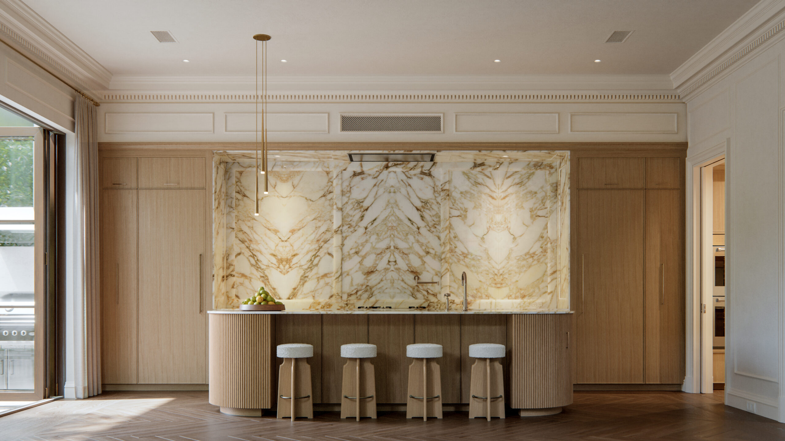Each home will span more than 5,000 square feet and feature private courtyards, loggias, summer kitchens, and four-car garages equipped with EV charging stations. Interiors will include Italian millwork, marble countertops, solid mahogany doors and windows, and high-end fixtures from Sub-Zero, Wolf, and Waterworks. Smart-home technology will integrate lighting, music, and security systems.