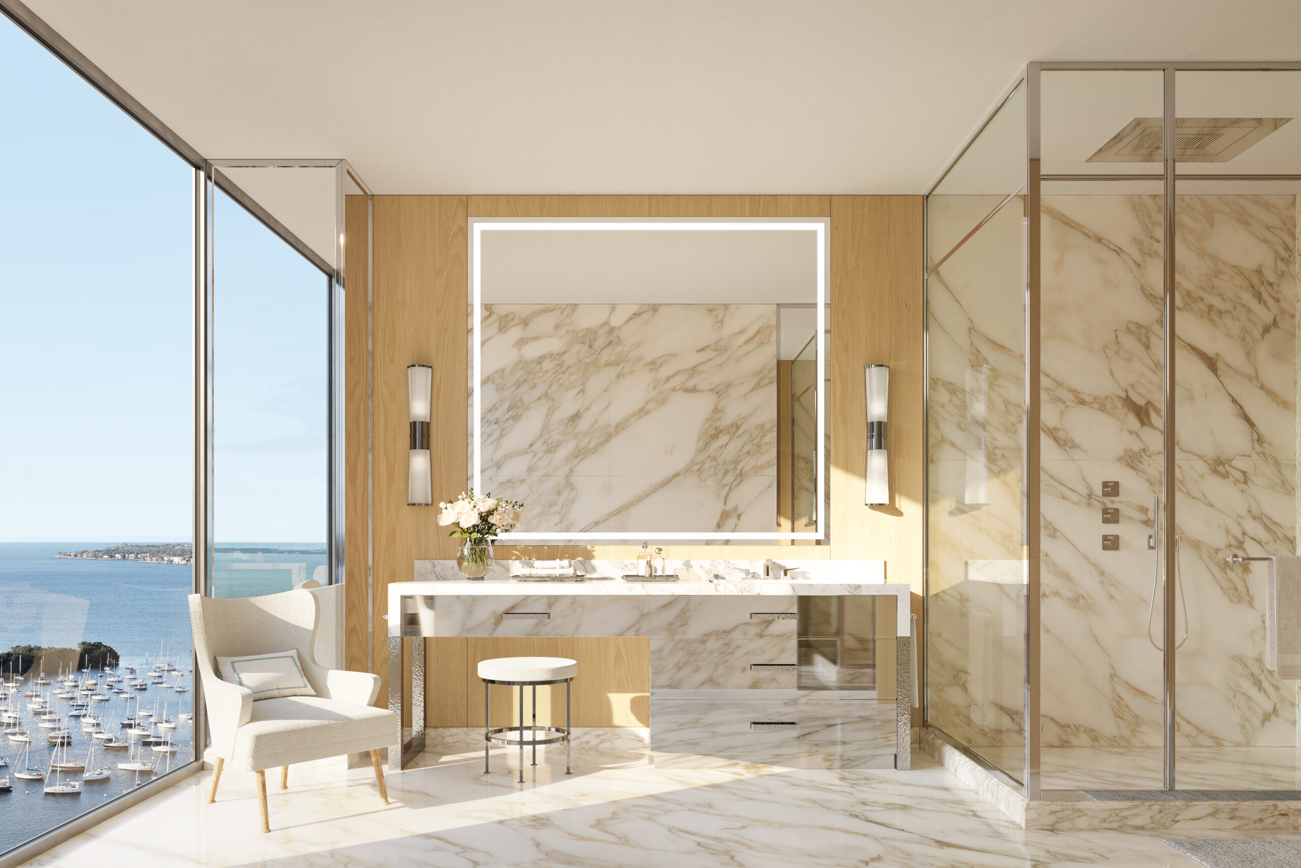 Residences will feature open floor plans with ceiling heights ranging from 10 feet 4 inches to 11 feet 6 inches, complemented by floor-to-ceiling windows and private elevator access to individual foyers. Interiors will include custom Italian kitchens designed by Molteni and Michele Bönan Interiors, featuring high-end European appliances and Italian marble finishes. Homes will also incorporate advanced lighting and automation systems throughout.