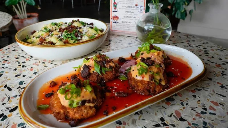 Don’t skip: Crab beignets, hot fried chicken sandwich.