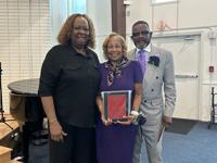 Rev. Gloria W. Dixon (left) gifts Trinity Pastor Calvin Hopkins and first lady Denise Hopkins a plaque in honor of the centennial.