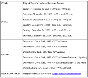 The City of Doral invites residents and members of the community to be part of this year’s Holiday Event Series, filled with festive traditions, family fun, and community spirit.