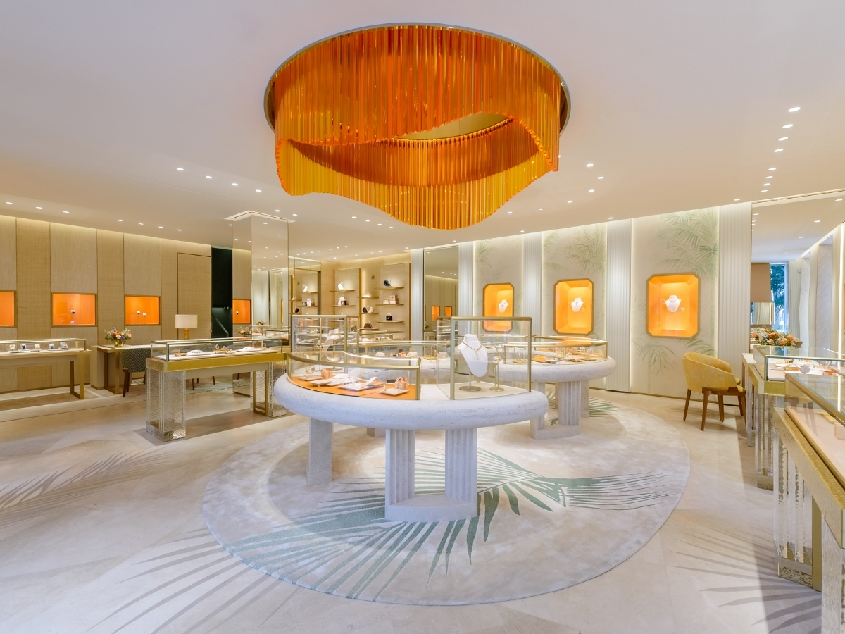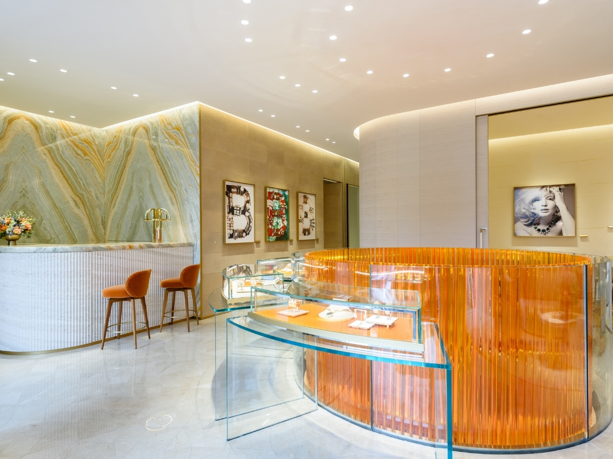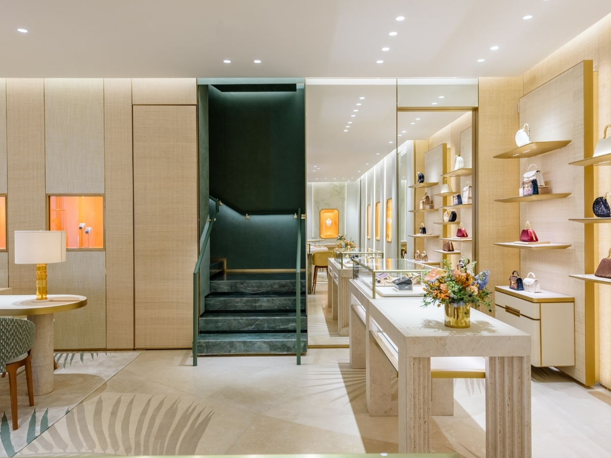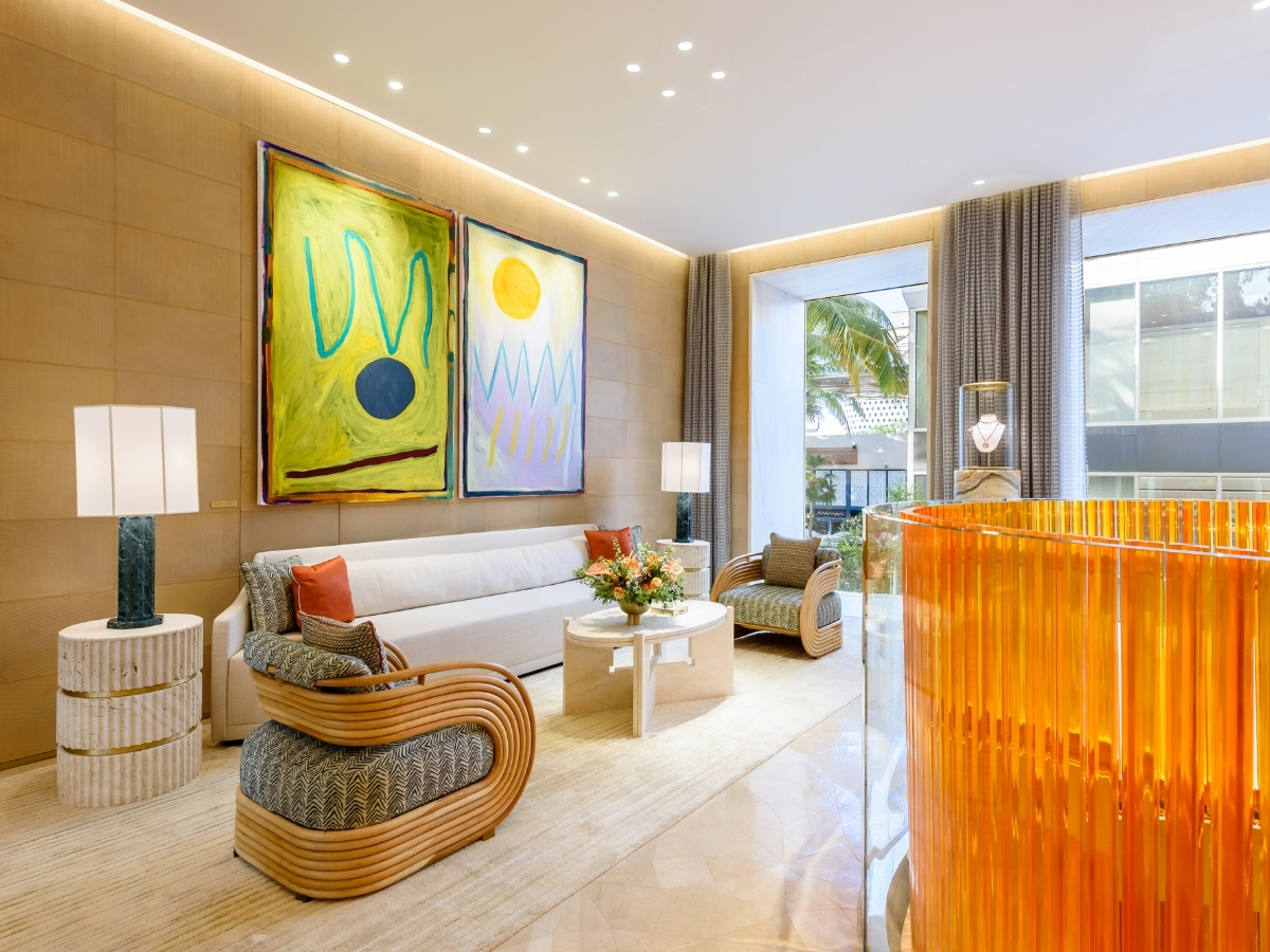 Inside, the boutique unfolds with a new clarity. Travertine columns and fluted architectural lines recall Rome’s classical codes, while palm-etched details and a sculptural chandelier nod to Miami’s light, and coastal energy. Spanning over 3,200 square feet, the boutique brings together high jewelry, fine jewelry, watches, handbags, and fragrance. Upstairs, the second-floor salon is designed for private client moments and hosted gatherings, adding a sense of luxury to the overall shopping experience.
