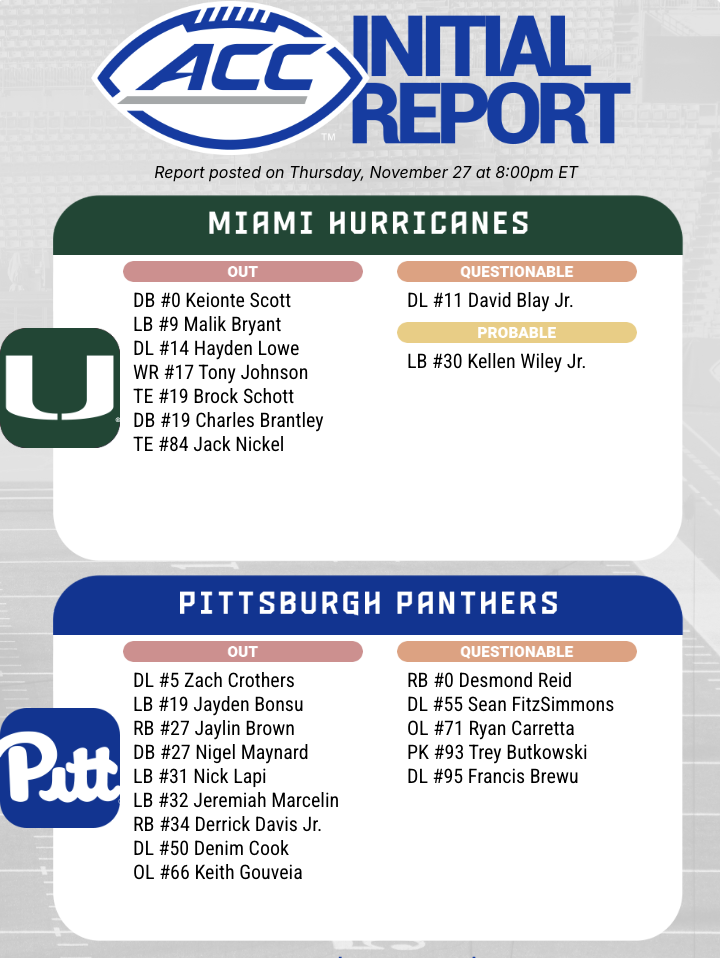 No. 22 Pitt football is set for a critical ACC clash against No. 12 Miami, but the Panthers have several of their key players once again listed as questionable heading into the regular-season finale.