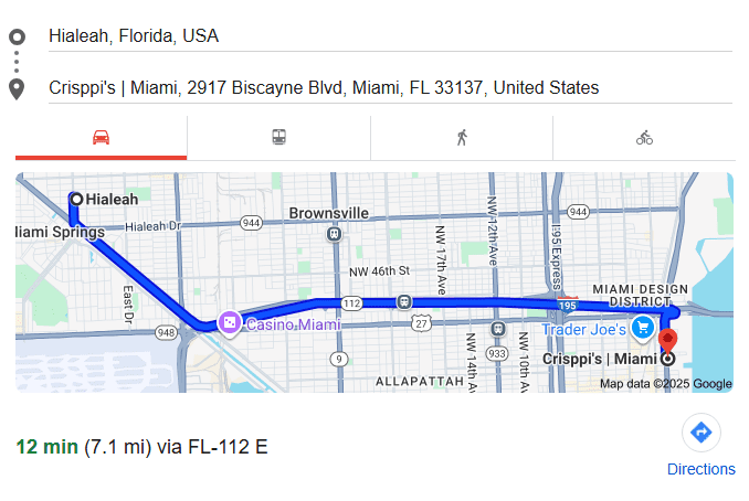 A quick look showed a straight shot from Hialeah to Crisppi’s Miami, about 12 min (7.1 mi) via FL-112 E, depending on traffic; nothing crazy, but short enough that the food had better be worth it.