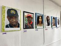 Portraits of Miami hip-hop icons line the wall.