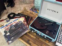 A record player along with records from Miami hip-hop stars adorns a table.