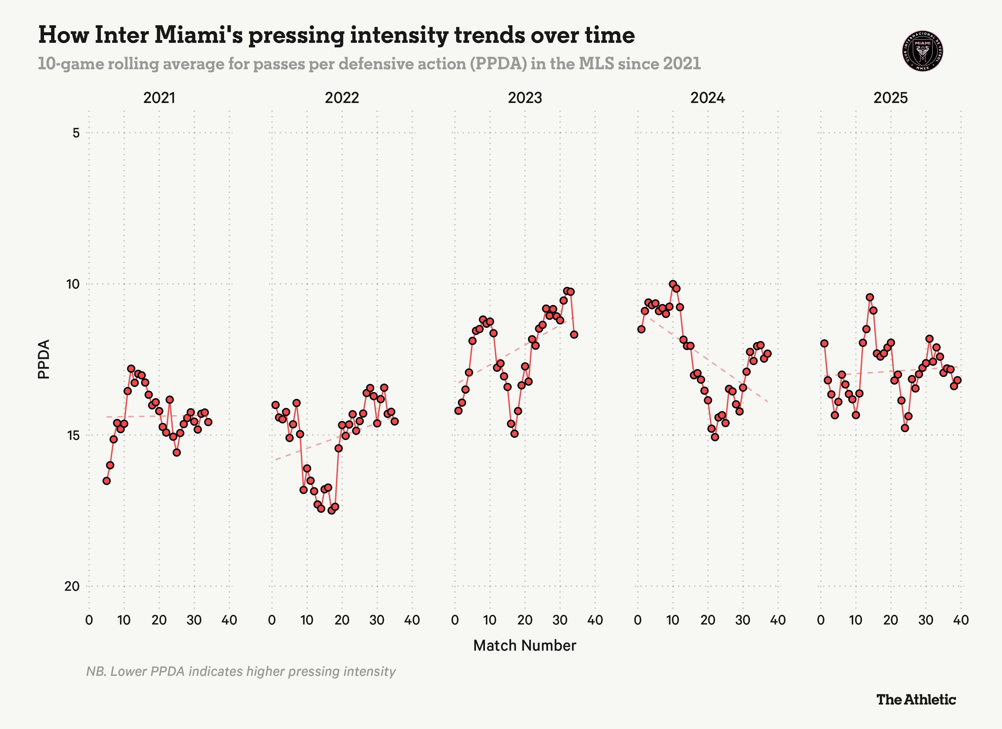 Among MLS forwards this season, Messi ranks 10th for possessions won in the final third per 90, a counter-pressing metric that supports Mascherano’s view. Rather than covering every lane, he is often the one setting the first line of pressure, showing he understands his defensive brief in this league. With fresher legs around him, the benefits of that positioning multiply.