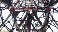 A child climbs the new multilevel rope structure installed as part of the park’s remodeled playground. The equipment is designed to support active, inclusive play.