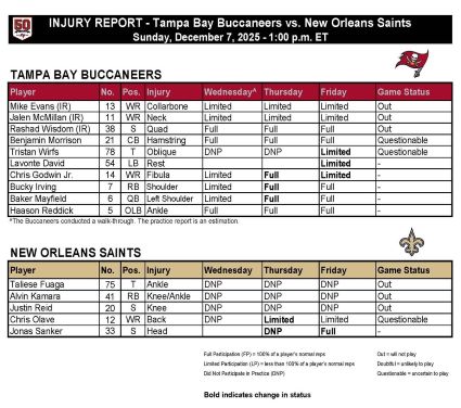 (The NFL, unless otherwise noted, does not include players on injury reports who are not on a team’s active 53-man roster. Players on injured reserve or the practice squad are not on a team’s active 53-man roster.)