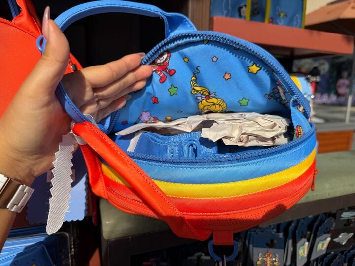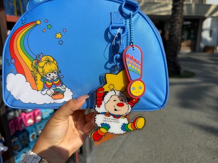 It has rainbow-colored webbing strap and sturdy metal hardware along with an acrylic charm of Twink, Rainbow Brite’s companion.
