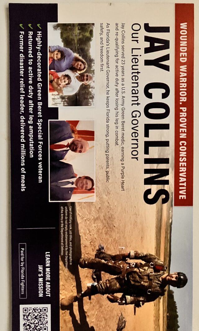Mail from the Florida Fighter group is circulating this weekend, including to Jacksonville Republicans, promoting the former state Senator from Tampa as a “wounded warrior, proven conservative” who has “delivered conservative wins” and is “standing with” Gov. Ron DeSantis.