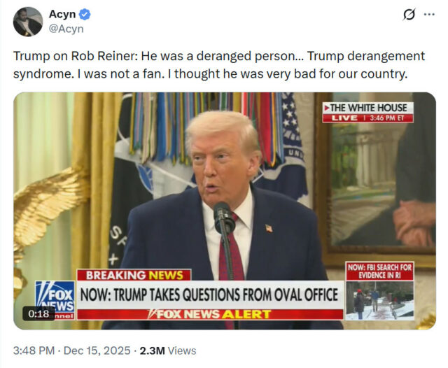 —@RealDonaldTrump: A very sad thing happened last night in Hollywood. Rob Reiner, a tortured and struggling, but once very talented movie director and comedy star, has passed away, together with his wife, Michele, reportedly due to the anger he caused others through his massive, unyielding, and incurable affliction with a mind crippling disease known as TRUMP DERANGEMENT SYNDROME, sometimes referred to as TDS. He was known to have driven people CRAZY by his raging obsession of President Donald J. Trump, with his obvious paranoia reaching new heights as the Trump Administration surpassed all goals and expectations of greatness, and with the Golden Age of America upon us, perhaps like never before. May Rob and Michele rest in peace!