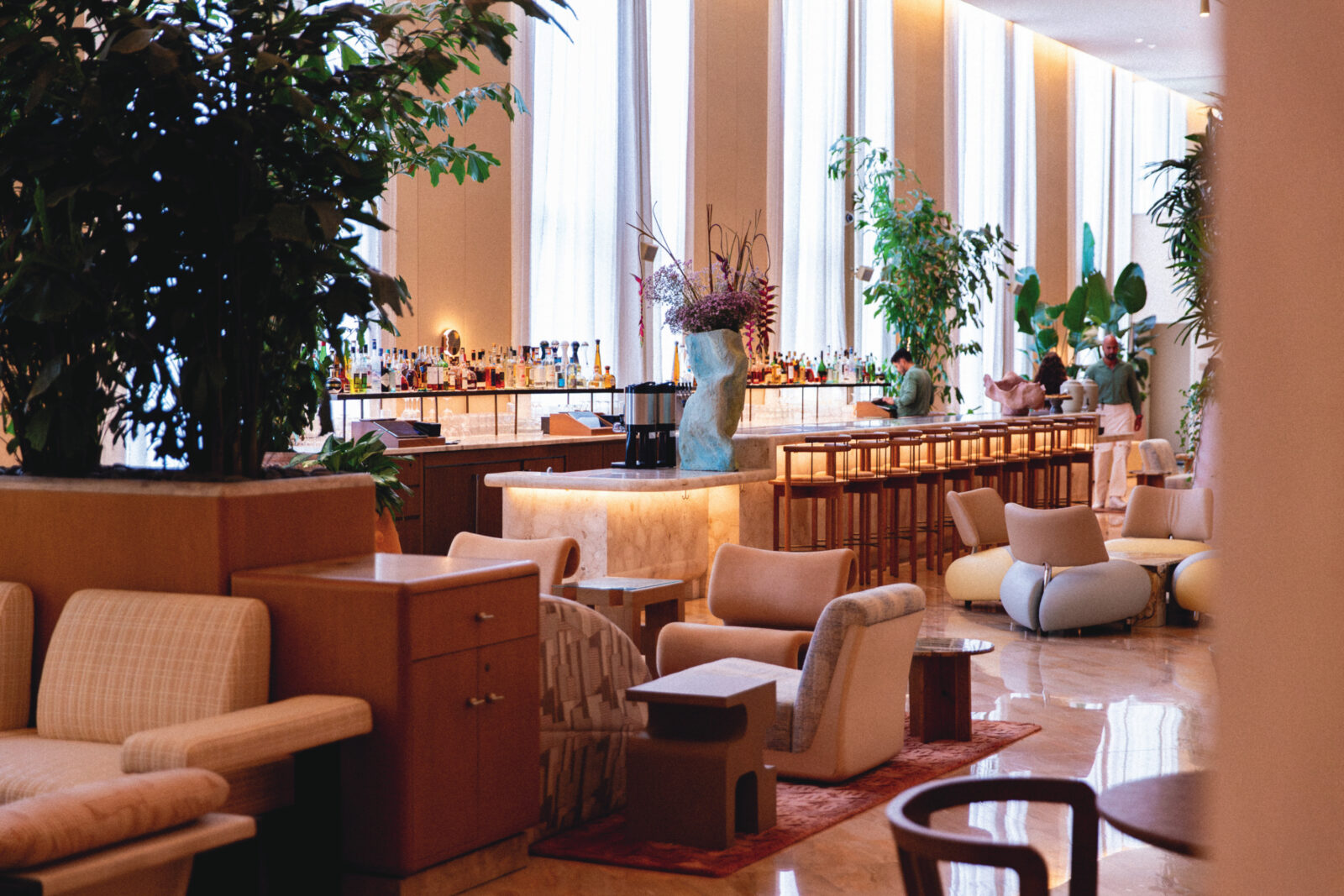If the pink-and-red marble walls of the Shelborne by Proper could talk, they’d tell stories of Frank Sinatra, the Beatles, and Marilyn Monroe. Originally opened in 1941, the Shelborne was one of Miami Beach’s glamorous art deco–era hotels frequented by anybody who was anybody. Today, after a $100 million reimagination, its 251 rooms are once again all glammed up. The curvy, organic lines of the furniture, plus abundant artwork and lush greenery, give the whole place a playful vibe, and the photogenic 1950s diving platform still proudly anchors the palm-lined pool.