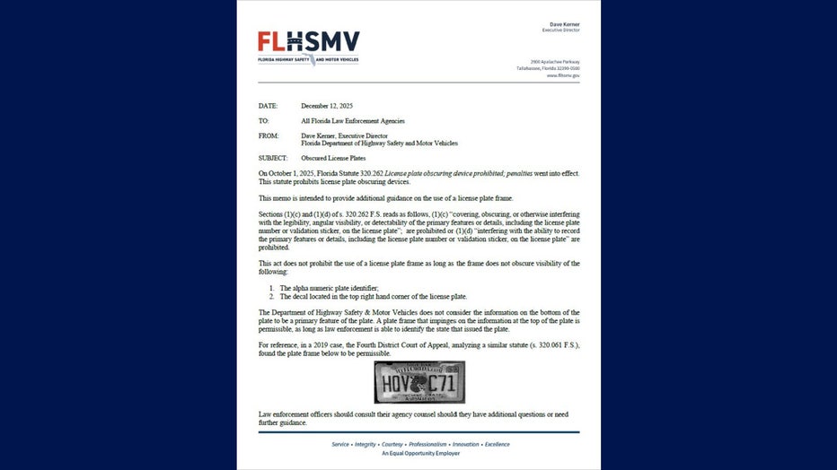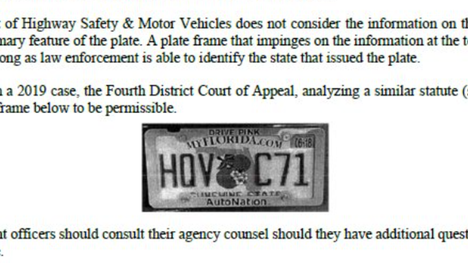 The Florida Department of Highway Safety and Motor Vehicles issued a new memo to help clarify the new law about Florida license plate frames. (Courtesy: FLHSMV)