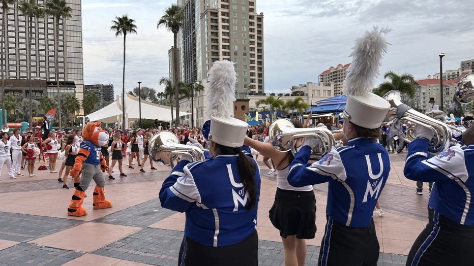 On Thursday night, hundreds gathered at the Sail Pavilion in downtown Tampa, where both school’s bands and mascots performed. Coaches and players also addressed the crowd on hand.