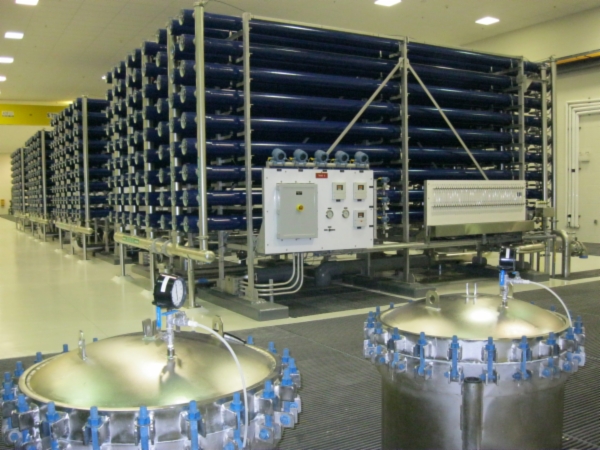 Once through the filters, the pretreatment process is complete and the raw water becomes “feed water.” The feed water is pumped with high pressure pumps into the Trains for primary treatment. When the feed water travels across the membrane elements, it is separated into usable (product) and non-usable (concentrate) water. Pretreatment keeps dissolved solids in liquid form during this separation.