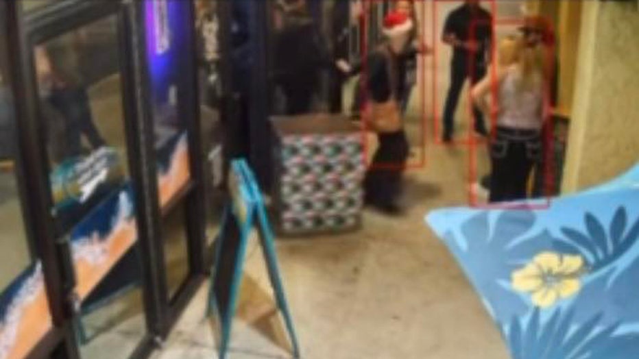 Surveillance video showed the woman, wearing a Santa hat, sitting at the bar earlier, leaving and dragging a large box of donated toys out of the restaurant.