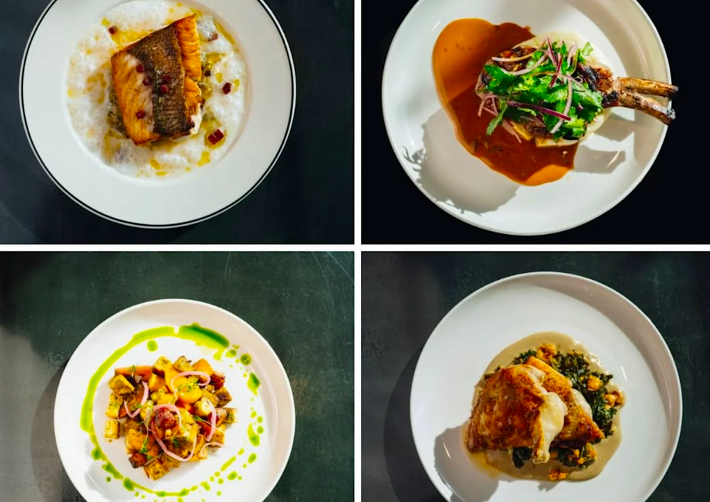 A Wagyu beef carpaccio can be found in a Cuban sandwich featuring lechón tonnato sauce, pickles, and sazón completa, as well as cured egg yolks. Seafood dishes include wahoo crudo with sweet potato relish, crispy canchitas, and coconut leche de tigre.