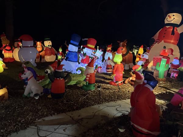 Welcome to Our Christmas Wonderland! Step into almost 2 acres of twinkling lights, holiday magic, and inflatable cheer! From Santa-hat kitties guarding the donation box to glowing octopus elves, festive dinosaurs, and a rooster dressed for the North Pole—there’s something smiling at you from every corner. Wander through candy canes, …    More »
