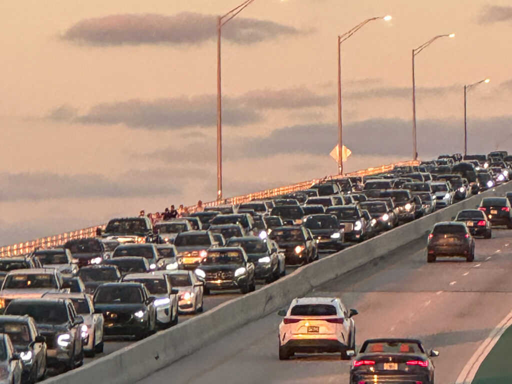Cars in a 7-mile traffic jam on the William Powell Bridge exiting Key Biscayne, Sunday April 14 2024 The jam came on the first day of two-month closure of the flyover ramp from Key Biscayne to I-95 and U.S. 1. (KBI Photo/Tony Winton)