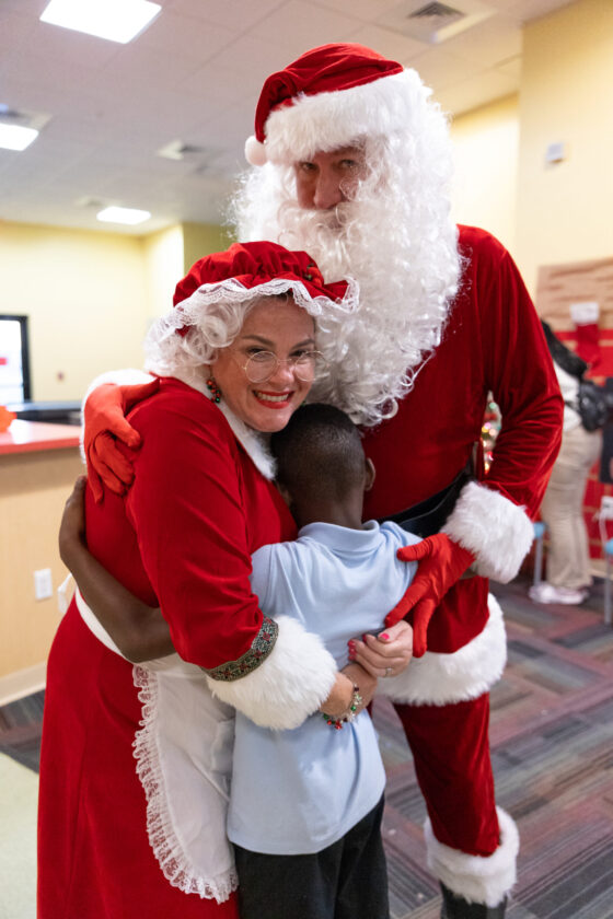 A member of the Renaissance Preserve Neighborhood Club hugs Mrs. Claus and Santa Claus during the Adopt-a-Club Holiday Party. HELEN WERNER PHOTOGRAPHY