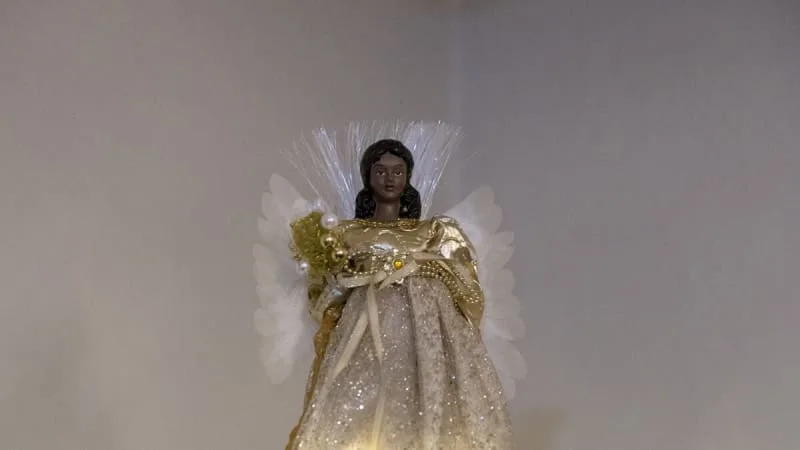 At the top, wearing a gold-trimmed gown, perched an angel.