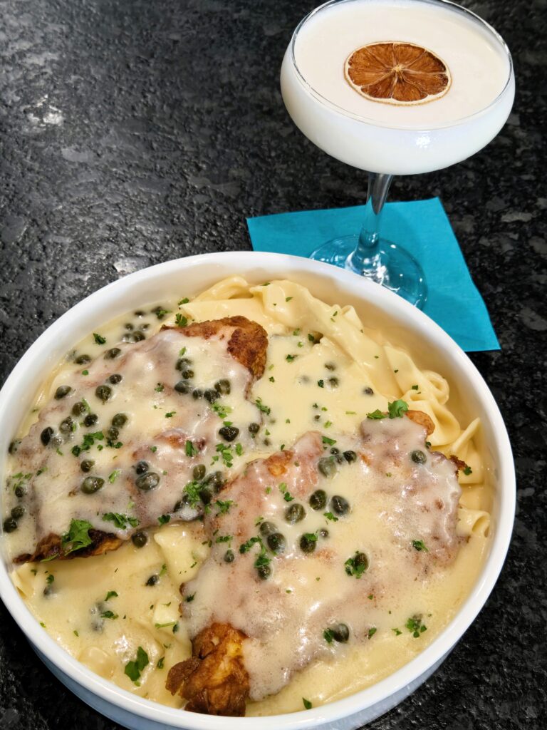 The chicken piccata features lightly coated sautéed chicken breasts with lemon caper sauce over tender pappardelle noodles.