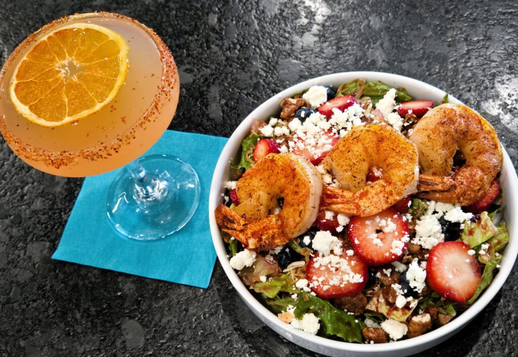 Loaded with fresh fruit, feta and candied pecans, the Berry Orchard romaine salad pairs perfectly with grilled shrimp and a Tropic Like Its Hot Bacardi Mango-Chile craft cocktail. [Photos by Malcolm McClintock/New Pelican]