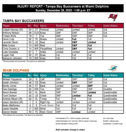 Fun facts: Bucs QB Baker Mayfield Has a touchdown pass in 14 of his past 15 games. Mayfield currently has a three-game road winning streak. … RB Bucky Irving is looking for his seventh game in a row with at least 70 yards from scrimmage. … WR Mike Evans had 113 receiving yards and two touchdowns in his last game against the Dolphins in October 2021. … DT Vita Vea had a pass defensed last week. … ILB Lavonte David led Bucs last week with 10 tackles and a sack. … CB Jacob Parrish had five tackles and a pass defensed last week. … Dolphins QB Quinn Ewers completed 20 of 30 attempts (66.7 percent) for 260 yards in his first NFL start. … RB De’von Achane led Miami with 90 scrimmage yards in Week 16 and is fifth in NFL with 1,726 scrimmage yards in 2025. … WR Jaylen Waddle had 5 receptions for 72 yards in Week 16. Waddle has five or more catches of 70 yards in four of his last five home games. … OLB Bradley Chubb has a sack in two of his last three games at Hard Rock Stadium. … LB Tyrel Dodson had 8 tackles in Week 16. Aims for his seventh in a row at Hard Rock Stadium with 8 or more. … DL Derrick Brown has just one sack since the end of October. … CB Rasul Douglas had 6 tackles and a pass defensed in Week 16.