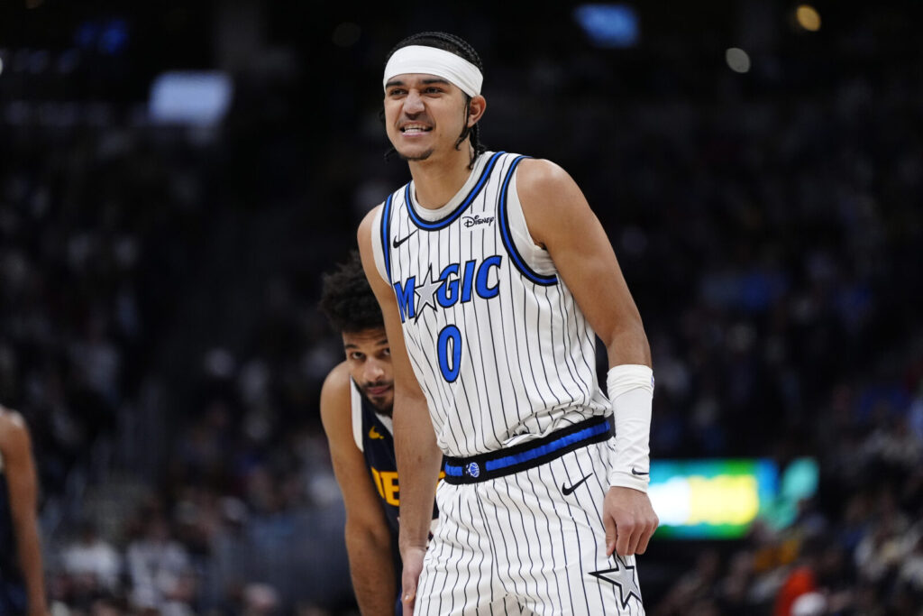 Dec 18, 2025; Denver, Colorado, USA; Orlando Magic guard Anthony Black (0) reacts in the second quarter against the Denver Nuggets at Ball Arena. Mandatory Credit: Ron Chenoy-Imagn Images