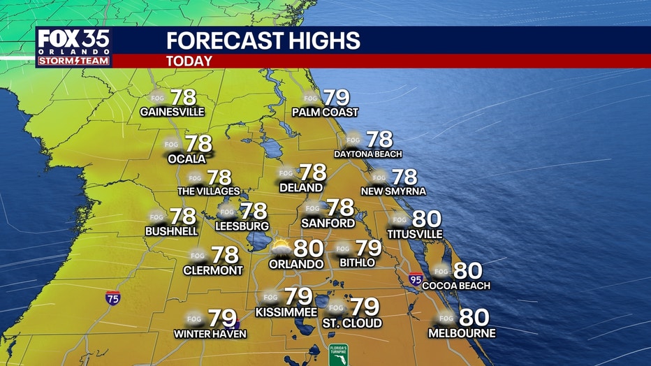 Temperatures will be quite warm today, once again. Temperatures will be warming to highs in the upper 70s and low 80s, with a high of 80° in Orlando.Â
