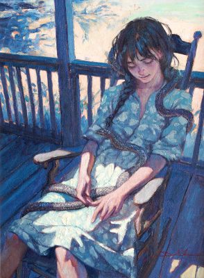 “To that effect,” Daniel says, “I played with contrast throughout the painting. The straight, rigid lines of the veranda frame her in place while the curved fluid bodies of the snakes weave around her form. I kept most of the snakes in the shadow, so the hands and lap become a focal point, allowing the viewer to discover the serpents gradually rather than all at once.”