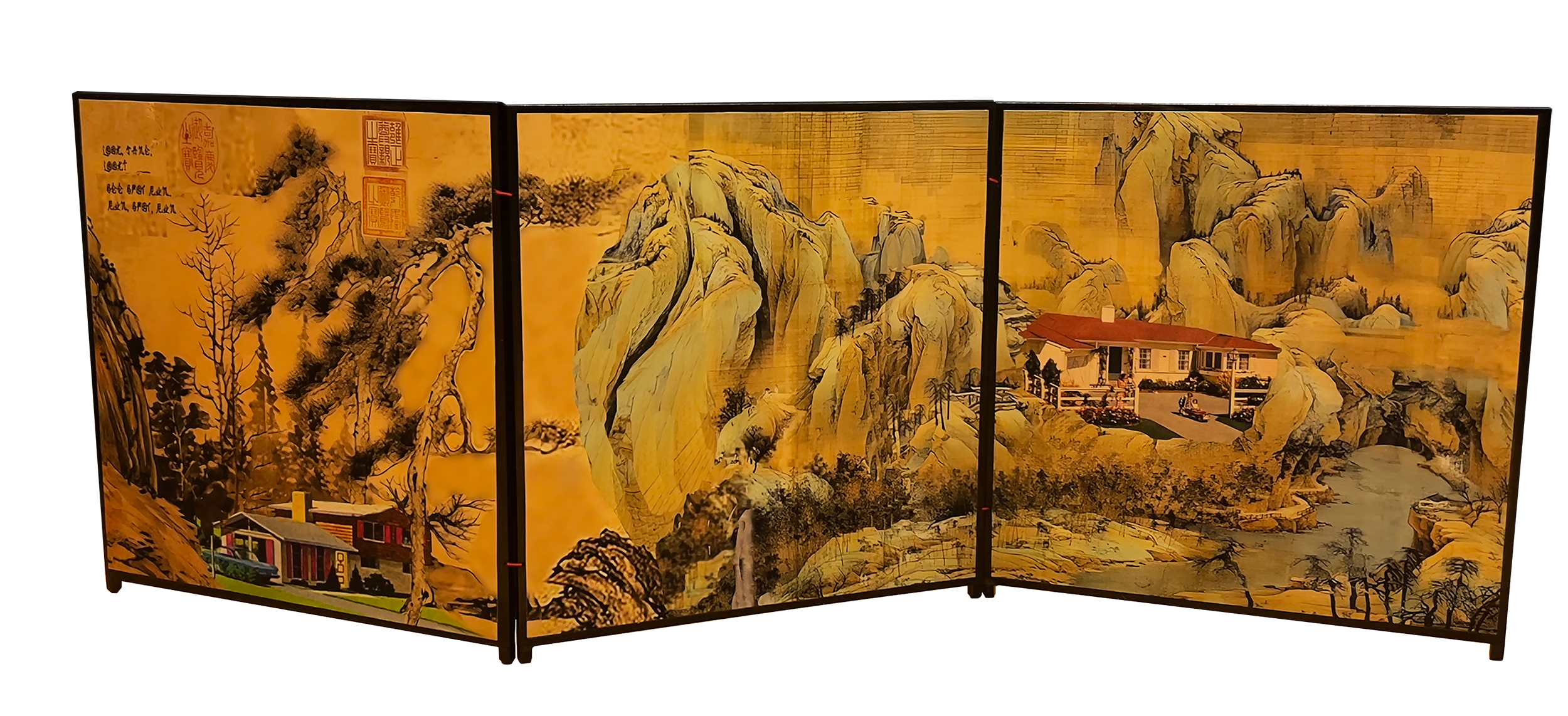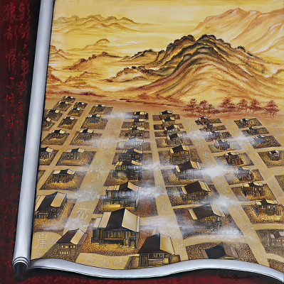 “I researched 1950s American tract houses and employed a bird’s-eye view composition. I then started by painting a fictional traditional T’ang dynasty landscape on the upper section of the canvas to set the tone and ambiance of that era, then gradually incorporated the American tract house structures. By employing the format of a T’ang dynasty handscroll, I transformed this East-West convergence into a dynamic Chinese scroll painting — essentially a painting within a painting that intertwines diverse cultures and historical epochs.”