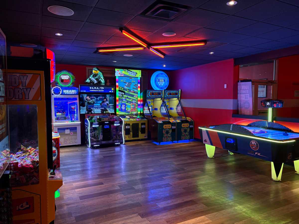 The arcade includes a New York Islanders air hockey table, Halo shooting game, Mario Kart racing game, Connect-4 basketball, and a massive claw machine with plenty of fluffy, oversized prizes.