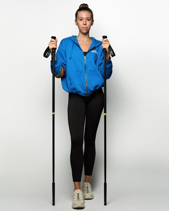 I’m not going to lie: I am a traditional Pilates and yoga girl, and when I saw the ski poles, at first I was like, Oh my God, what have I gotten myself into here? But it is one of the best workouts I’ve ever done.