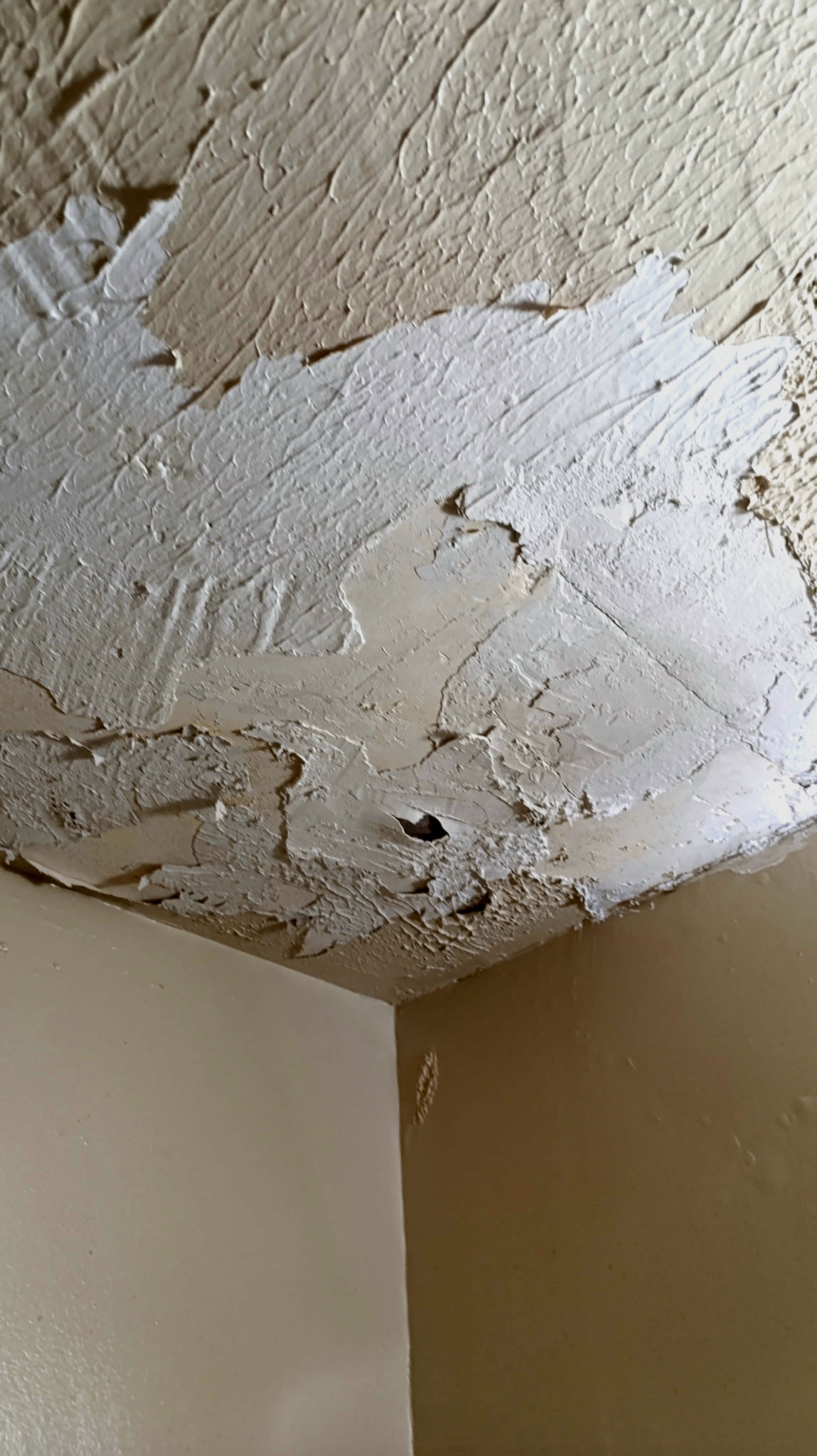 Water-damaged ceilings, missing tiles in lobby, and ongoing leaks in the garage.