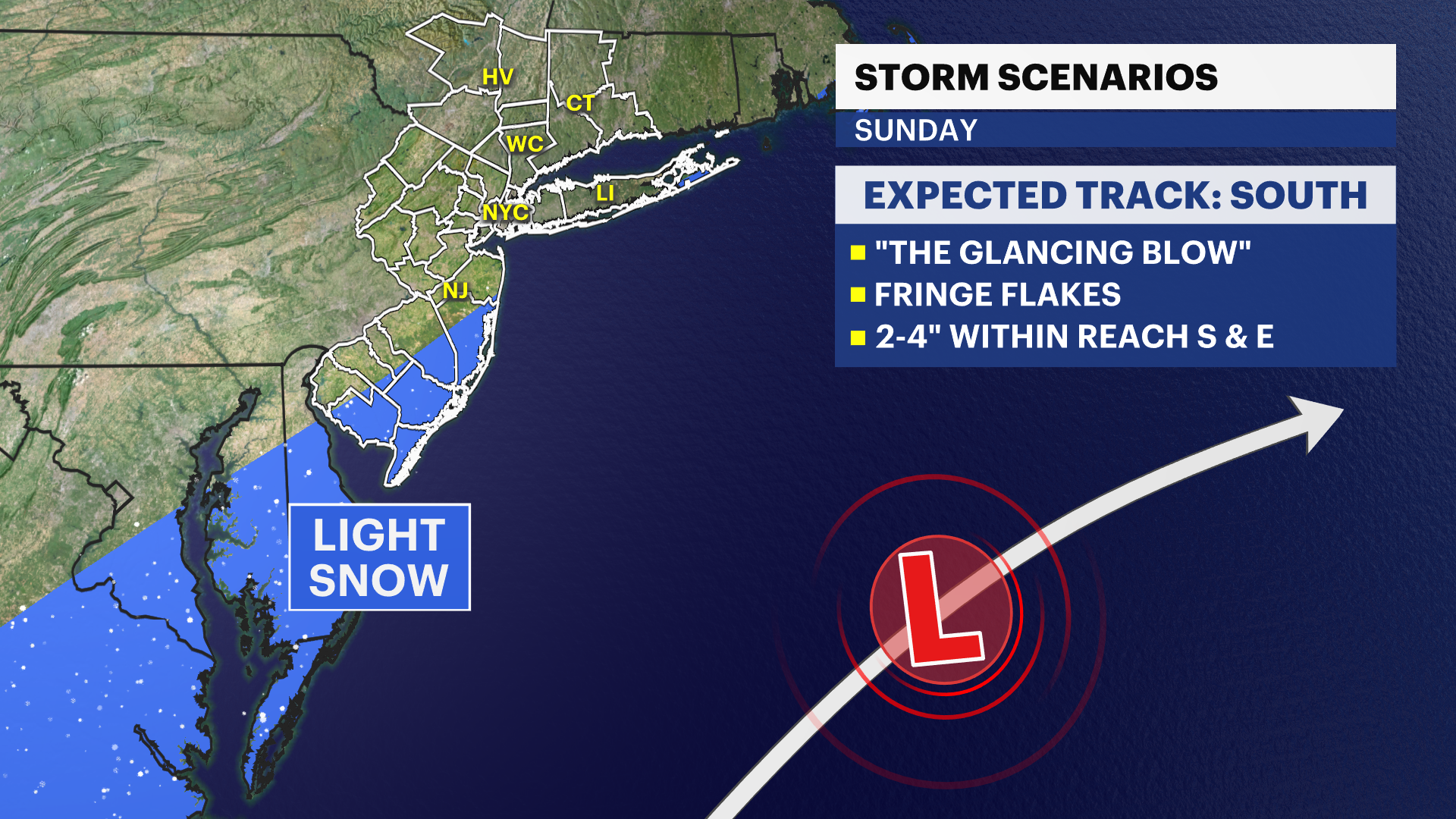Sunday could see a glancing blow of a coastal storm that’s expected to skirt just offshore of the area. However, it comes too close for comfort as areas along the New Jersey coastline and the East End of Long Island may experience light snow showers or flurries. Should this storm’s track adjust slightly to the north or west, then 2 to 4 inches of snow is not out of reach across southern New Jersey west of the New Jersey Turnpike or eastern Suffolk County. This may also include some accumulations across New York City, Nassau County, and even parts of Connecticut and lower Westchester if this shift happens. If Saturday’s storm is stronger, it is essentially “stealing” some energy from the Sunday event. If the Saturday storm is much weaker, then there is a potential for this to slide closer to the region. Based on the “glancing blow” forecast, the majority of the tri-state is not expected to receive snow on Sunday.