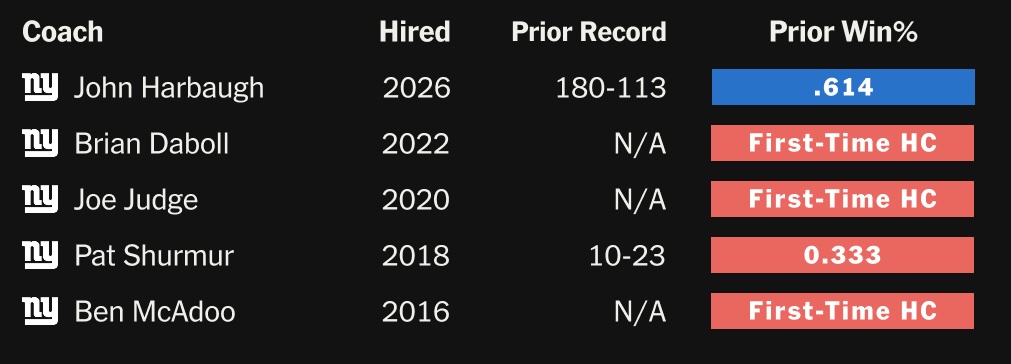 Since moving on from Tom Coughlin, they cycled through Ben McAdoo, Pat Shurmur, Joe Judge and Brian Daboll, none of whom lasted more than four years. Next to Harbaugh’s resume, theirs were laughable (though that’s true of almost all coaches):