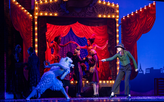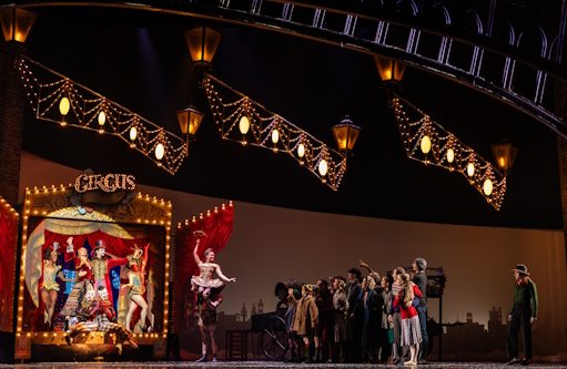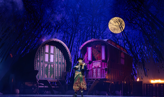 Lez Brotherston’s sets are as wonderful throughout as one has come to expect from the top designer. But he really outdoes himself with the circus travellers’ camp in the second act. Two traditional caravans in a forest clearing, a fire blazing as the moon peeks through the bare-branched trees, it really is a picture, one rather reminiscent of that in Frederick Ashton’s The Two Pigeons. It’s also a scene filled with fine dancing, especially in a men’s dance led by Edwards that’s powerful and athletic. Everyone threw themselves into it, the dance burning up the stage marvellously. Fortune teller Mazelda, Rishan Benjamin, was another strikingly powerful performer.
