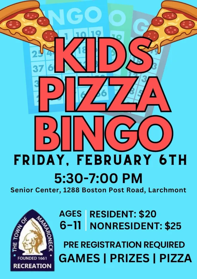The Town of Mamaroneck Recreation Department is hosting a Kids Pizza & Bingo Night on Friday, February 6, featuring pizza, bingo games and prizes for children ages 6-11. The event will take place from 5:30 p.m. to 7:00 p.m. at the Senior Center, located at 1288 Boston Post Road, Larchmont. The evening includes games, prizes and pizza.