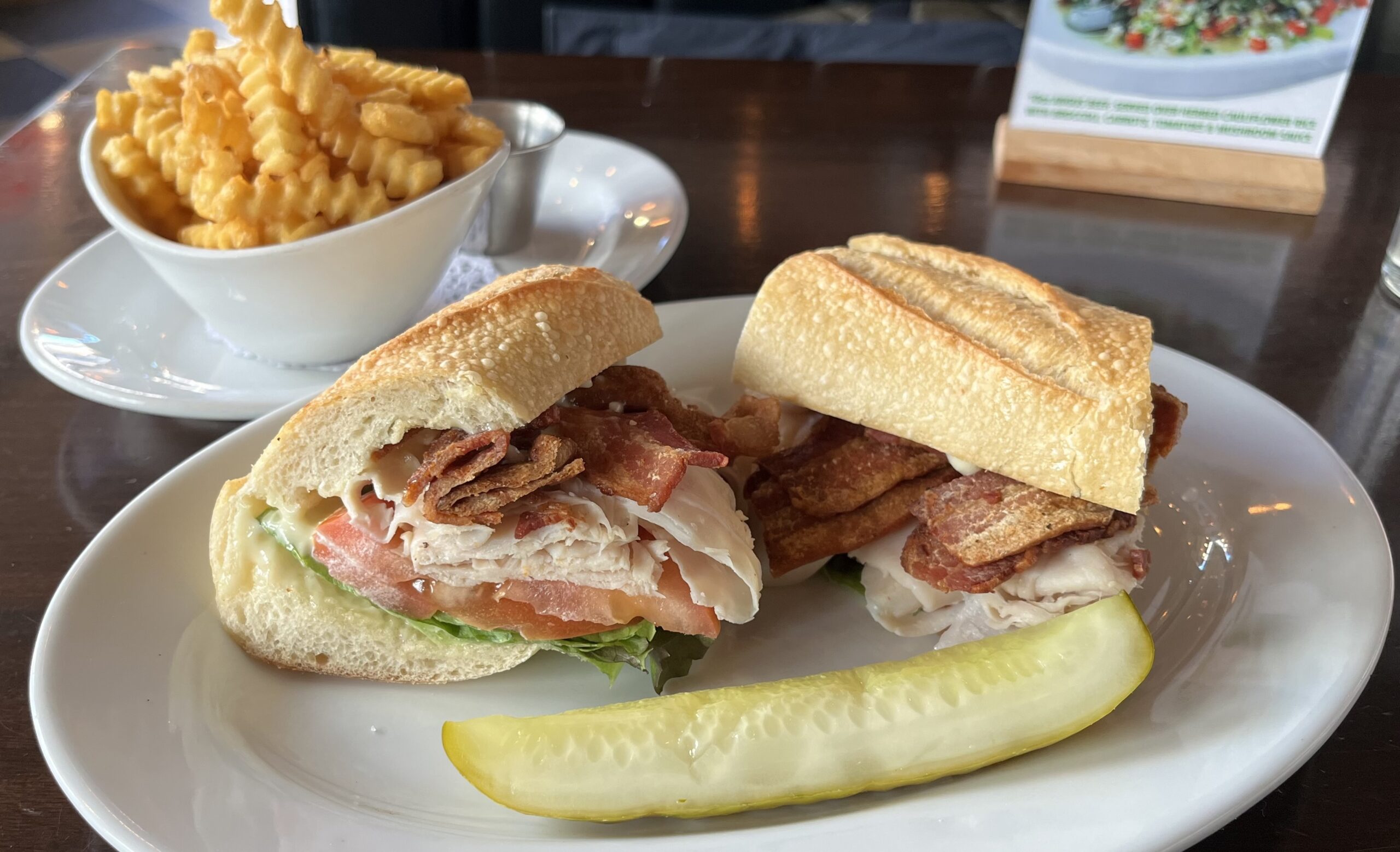 The crunch on the BLT, as delivered by both the baguette and dark bacon, was nothing short of fabulous – a great bite, nicely balanced by the tender, juicy turkey-breast and tomato layers and crispy fresh iceberg. The mayo, slabbed on both sides of the sandwich, was well dosed and brought every ingredient home.