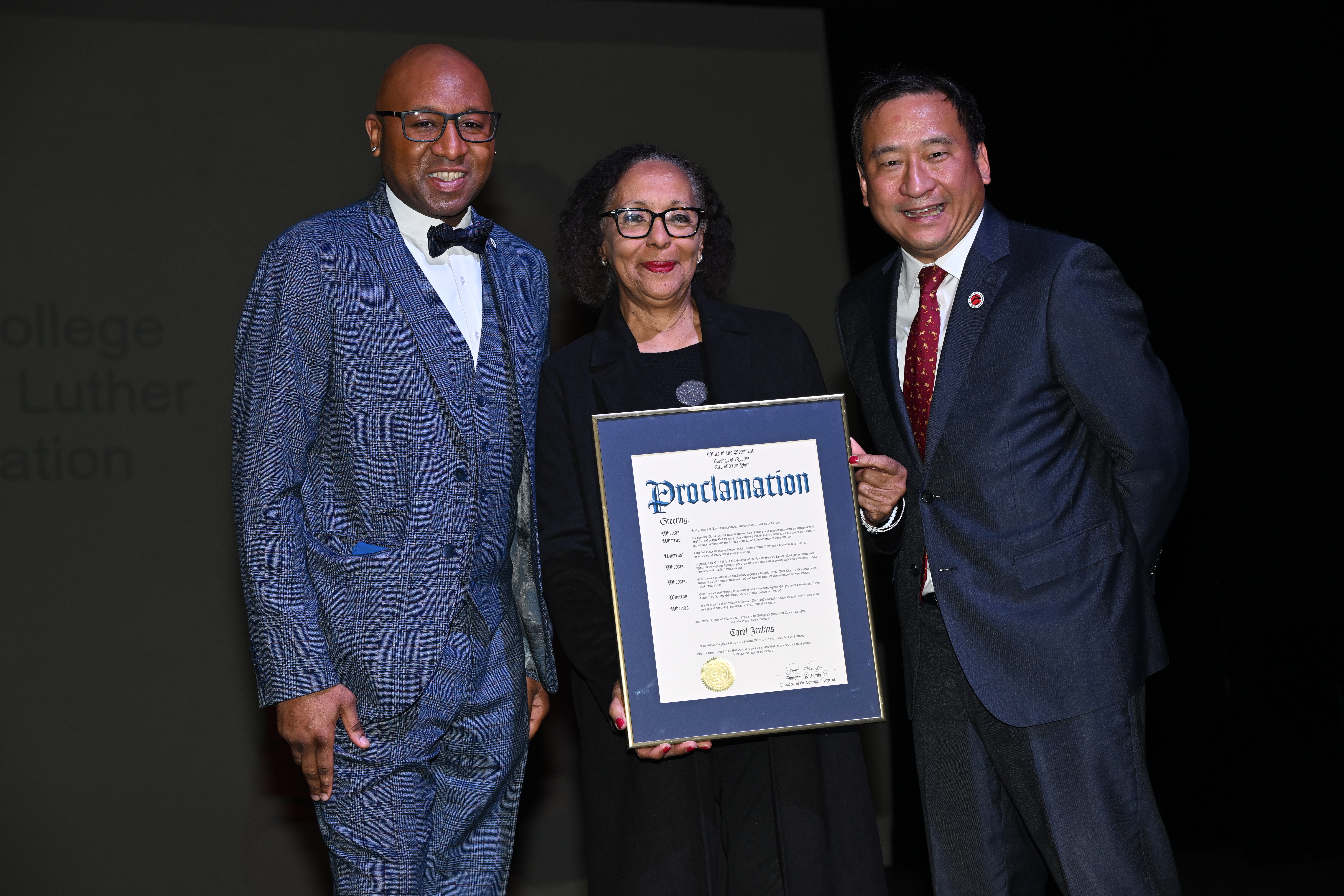 Queens Borough President Donovan Richards (left) and Queens College President Frank Wu (right) presented Carol Jenkins (center) with a Proclamation and the Queens College Reverend Dr. Martin Luther King Jr. Award. Photo by Ramy Mahmoud