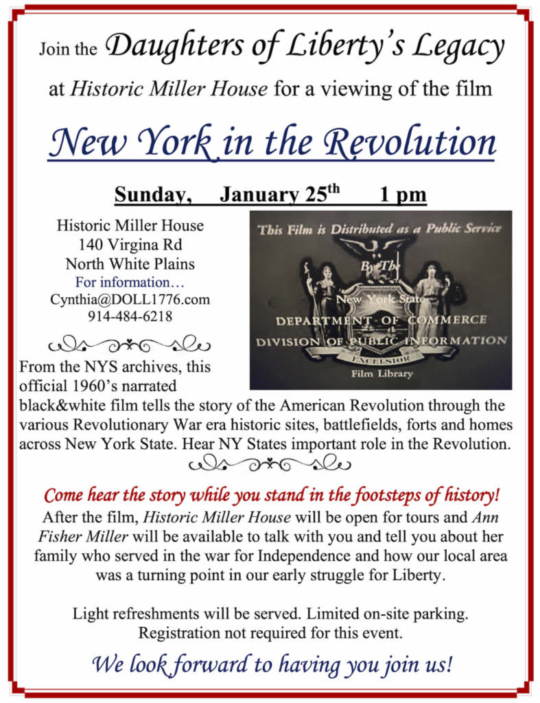 Join the Daughters of Liberty’s Legacy for a viewing of the film New York in the Revolution. From the New York State archives, this black and white film from the 1960s tells the story of the American Revolution through the lens of New York’s Revolutionary era historic sites, battlefields, forts and homes. Sunday, January 25 at 1 p.m., at the Historic Miller House, 140 Virginia Rd., North White Plains. Light refreshments will be served. The Historic Miller House will be open for tours after the film. Registration is not required for this event. For more information, contact Cynthia@DOLL1776.com or call 914-484-6218.