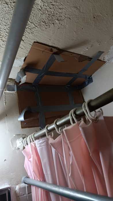 Cardboard covers a ceiling hole at Evergreen Gardens. Photo courtesy DiNapoli’s office