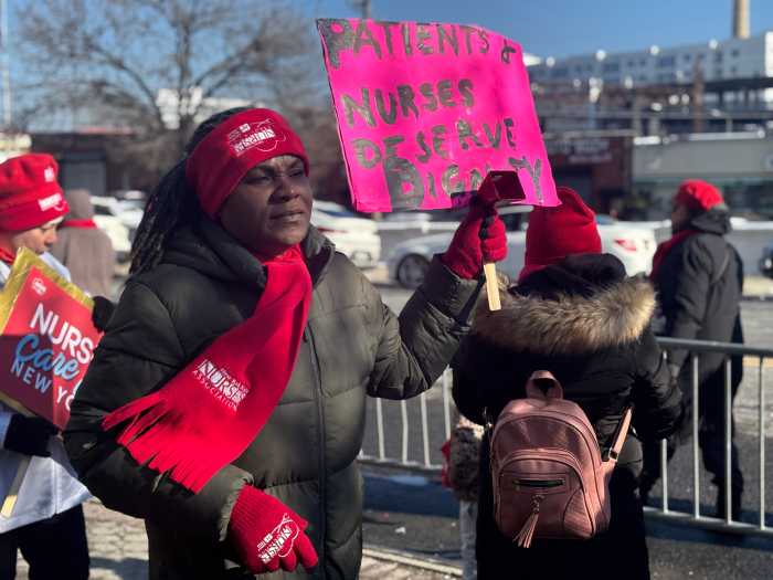 A striking nurse on the picket line held a sign demanding the Montefiore Hospital System put patients over profits. Photo by Renee DeLorenzo